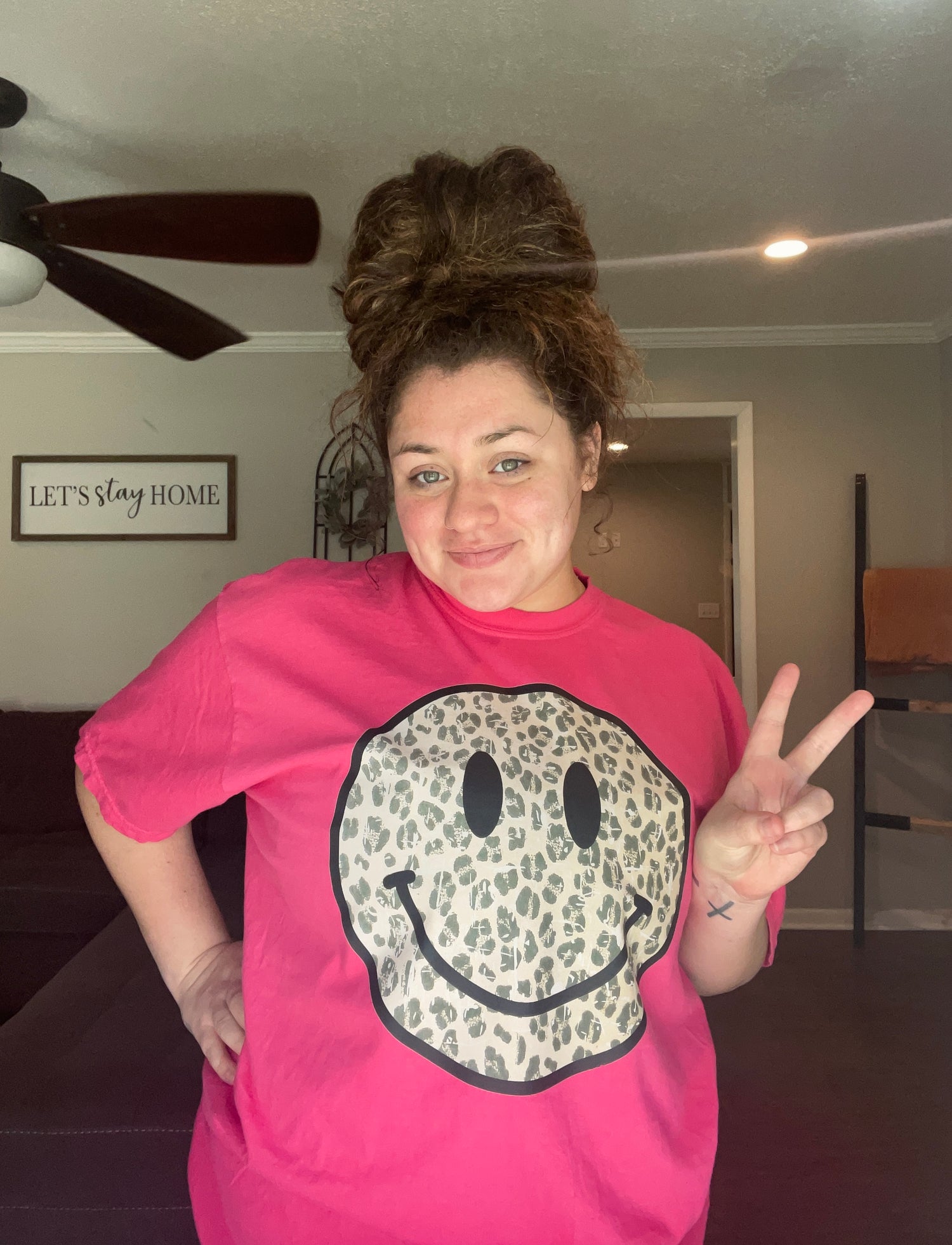 Leopard Smiley tee on a Comfort color t-shirt! True to size, go up a size for an oversized looser fit!